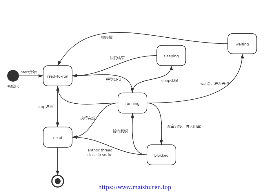 等待状态:调用了wait()方法,线程进入等待时间。而且会释放当前的锁,需要唤醒才能重新进入就绪状态(notify() or notifyAll()),等待CPU调度