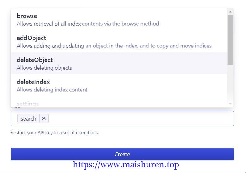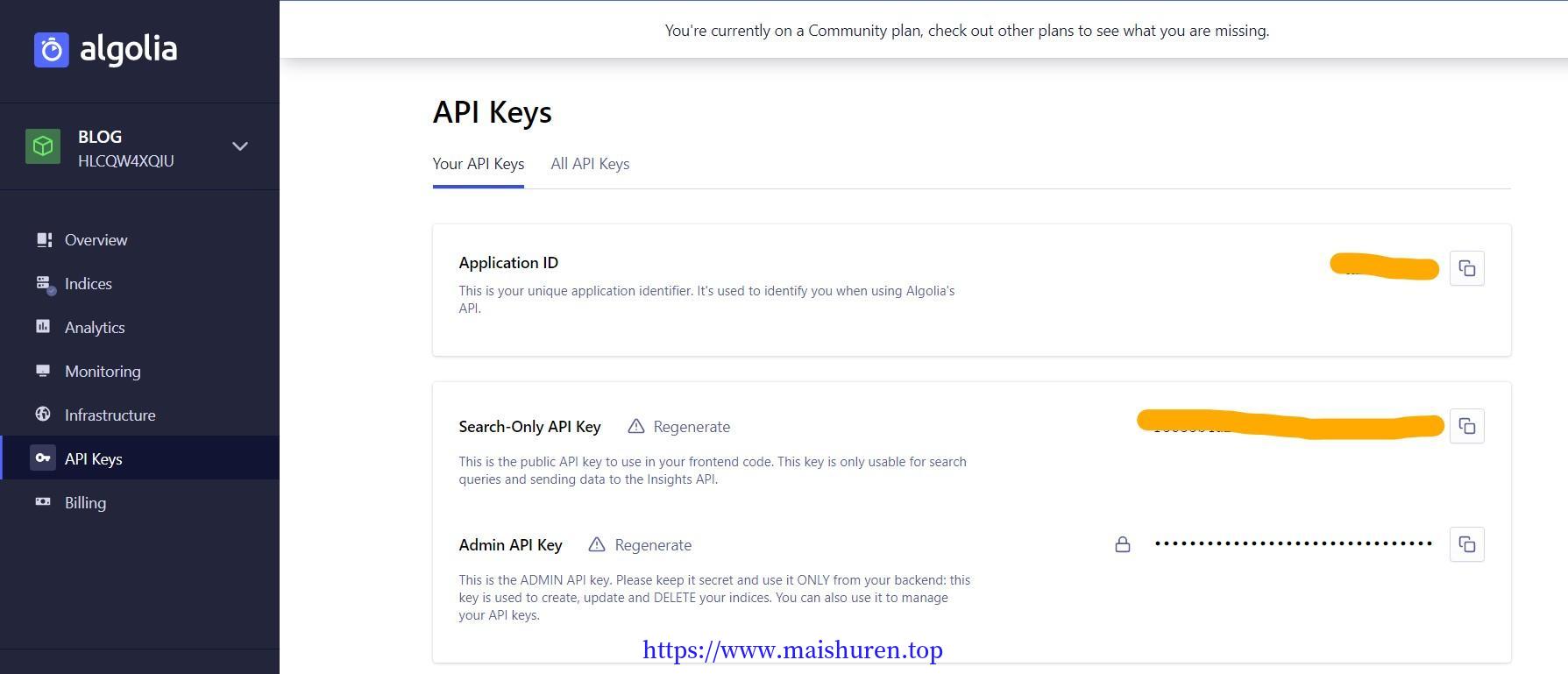 在Algolia的控制台中的API Keys中可以看到,因为一开始在博客的配置中是使用Search-Only API key,只能够搜索,不能进行更新索引,这个API Key没有足够权限,然后又发现是因为初始化就有的key,不能对其ACL进行修改。那只能新增一个Key。